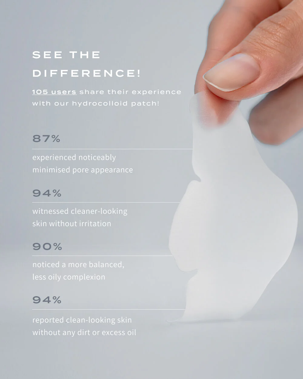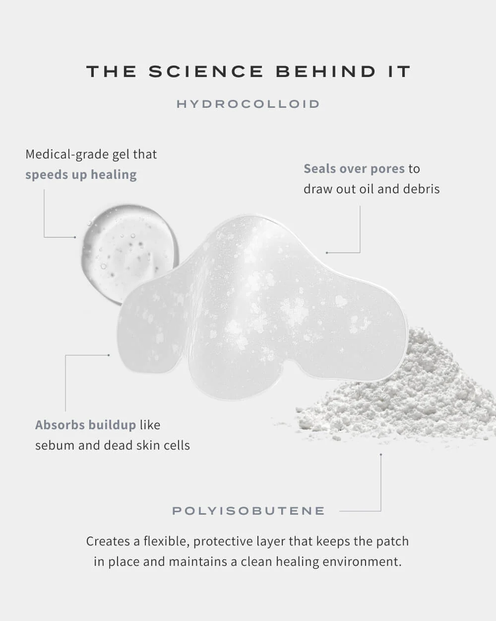 Scientifically formulated to absorb impurities and minimize pores, our patches harness the power of Hydrocolloid Technology to give your nose a refined, mattified look — without irritation or harsh chemicals.
